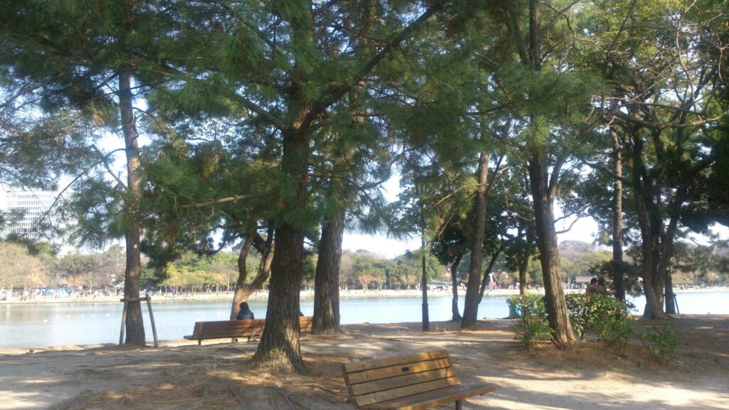 公園内には、池の周辺約2kmの周遊道、野鳥の森、児童遊園、能楽堂、日本庭園、および4つの橋で結ばれた中の島や浮見堂、ボートハウス等を配し休養、娯楽や体育の向上に利用されています。